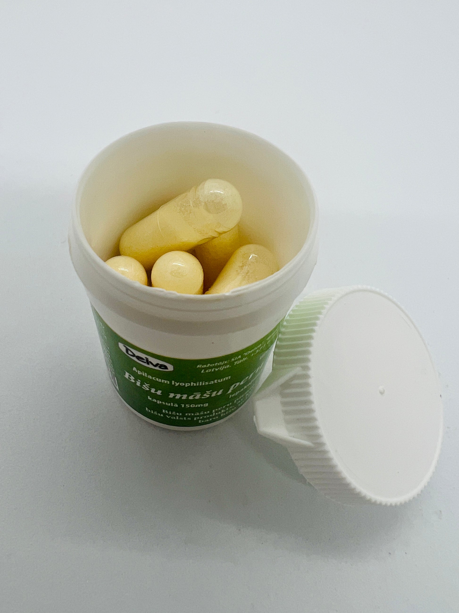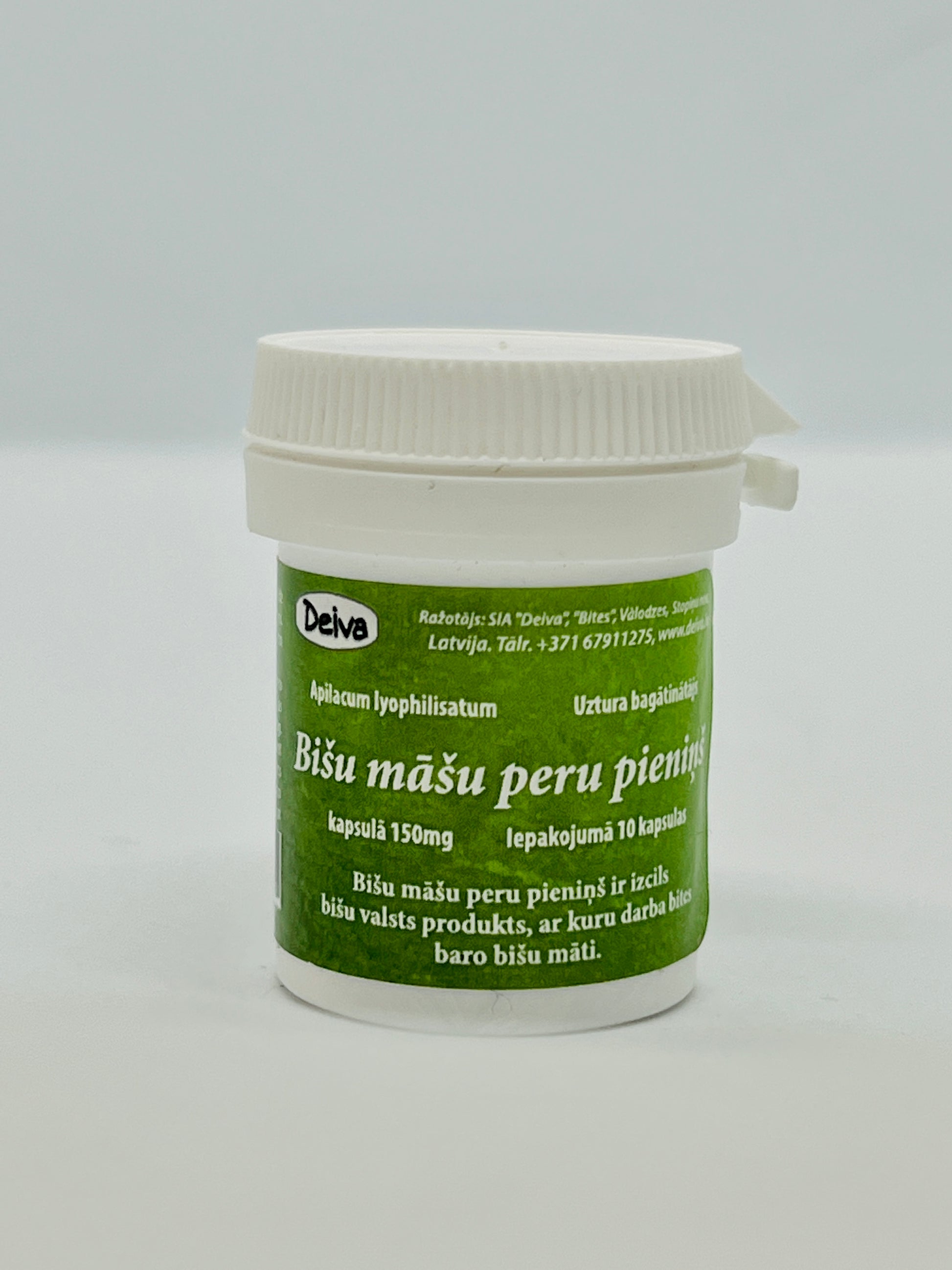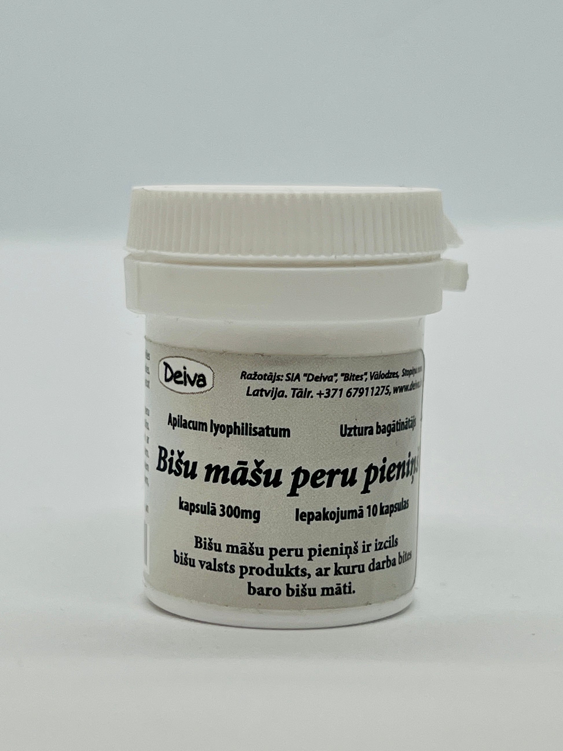 Sastāvs: bišu māšu peru pieniņš (liofilizēts), laktoze, kapsulas apvalks - želatīns.