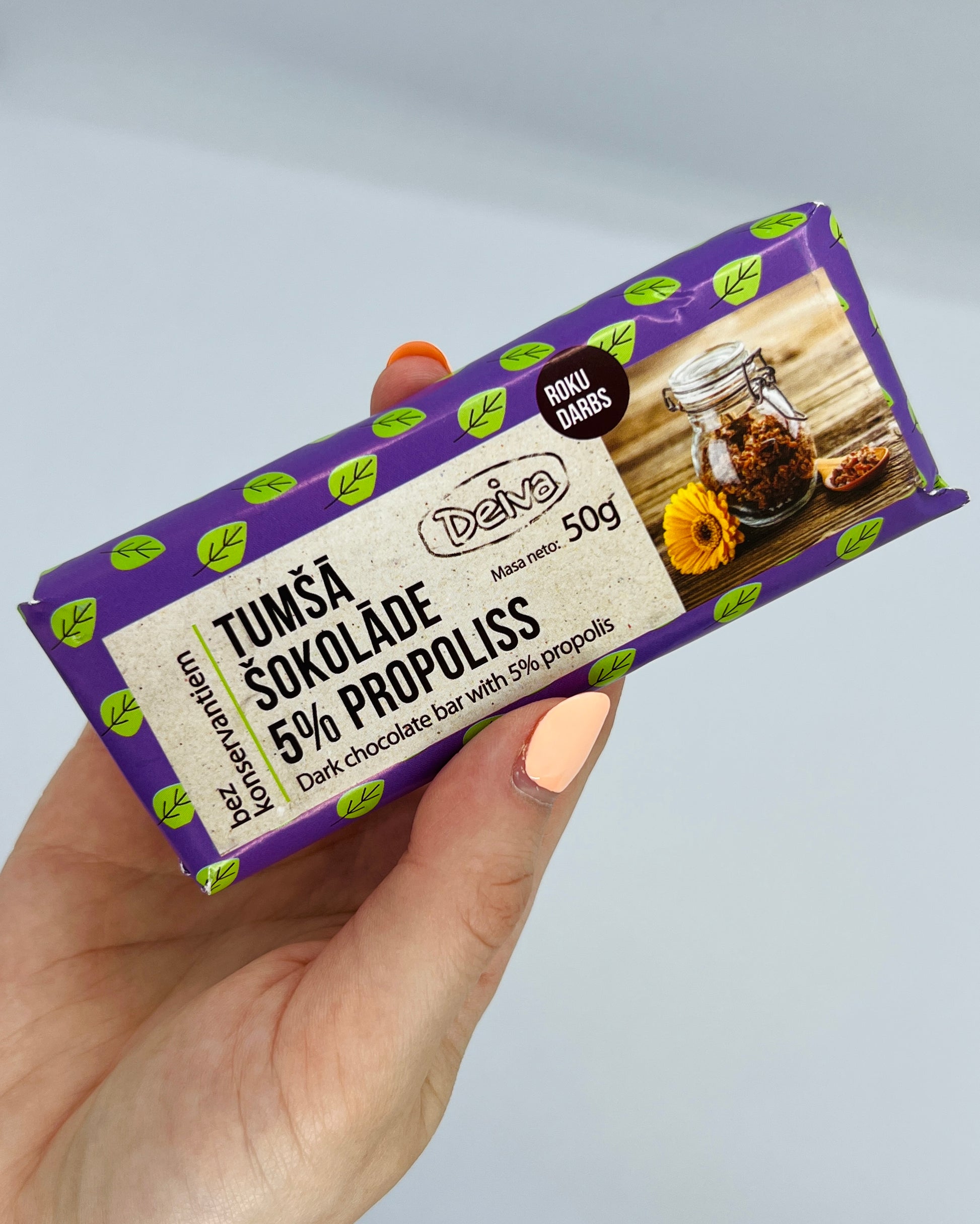 Šokolādi ar propolisu raksturo interesanta garšas kombinācija. Pamēģini! Šī šokolāde būs sevišķi piemērota gripas laikā. Lēni nosūkājot šokolādes gabaliņus, propoliss darbosies arī kā dabisks pretvīrusu līdzeklis.