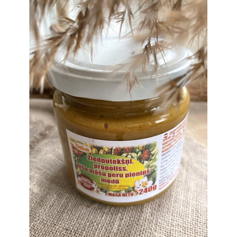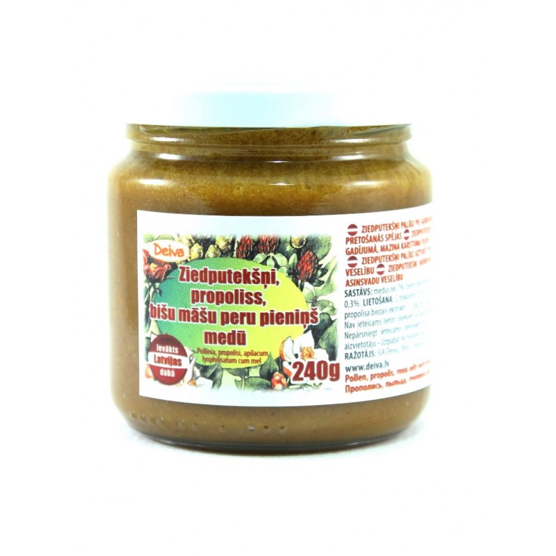 Sastāvs: medus, žāvēti ziedputekšņi, propolisa biezais ekstrakts, bišu māšu peru pieniņš (liofilizēts)
